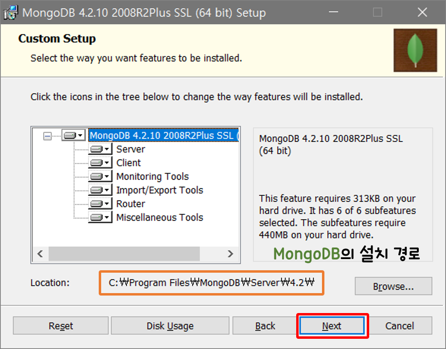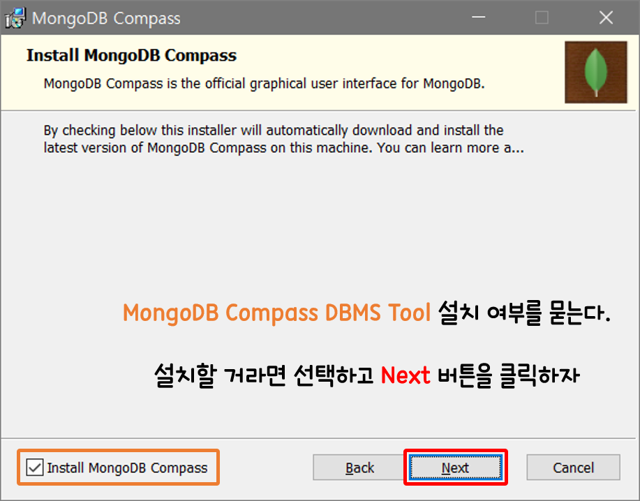 Install MongoDB Compass 항목을 체크하면 MongoDB를 다루는 DBMS 툴이 같이 설치된다.