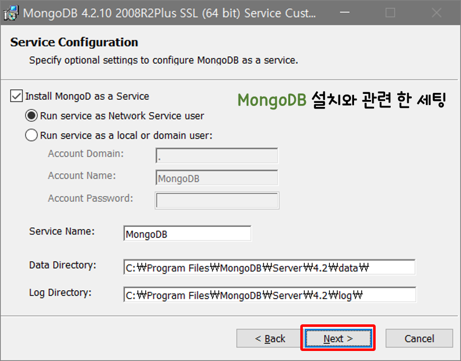 몽고DB 설치에 있어 기본 설정들은 위와 같이 잡힌다.