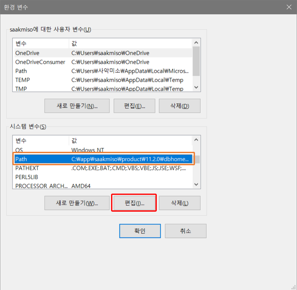 환경변수 > 시스템 변수의 리스트에서 Path를 선택하고 편집 버튼을 클릭한다.