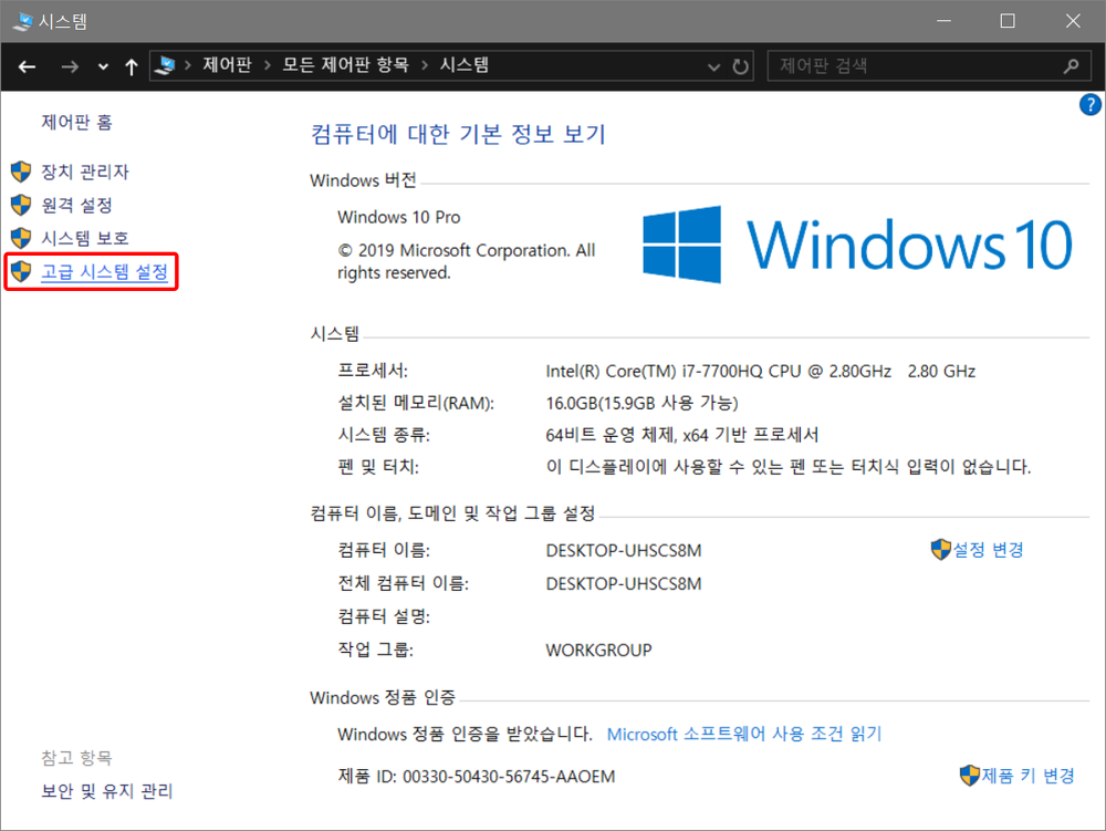 시스템창 좌측 메뉴에서 고급 시스텀 설정을 선택한다.