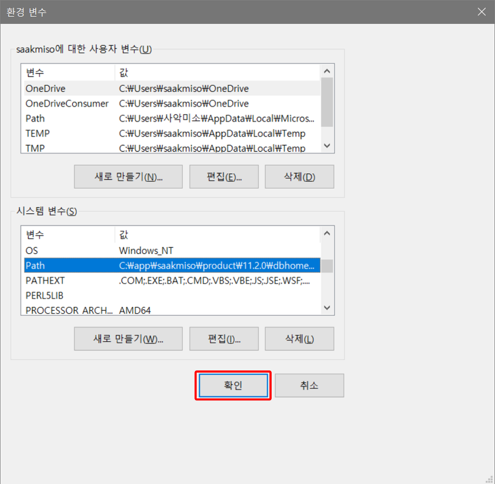 확인 버튼을 클릭하여 환경 변수의 변경사항을 저장한다.