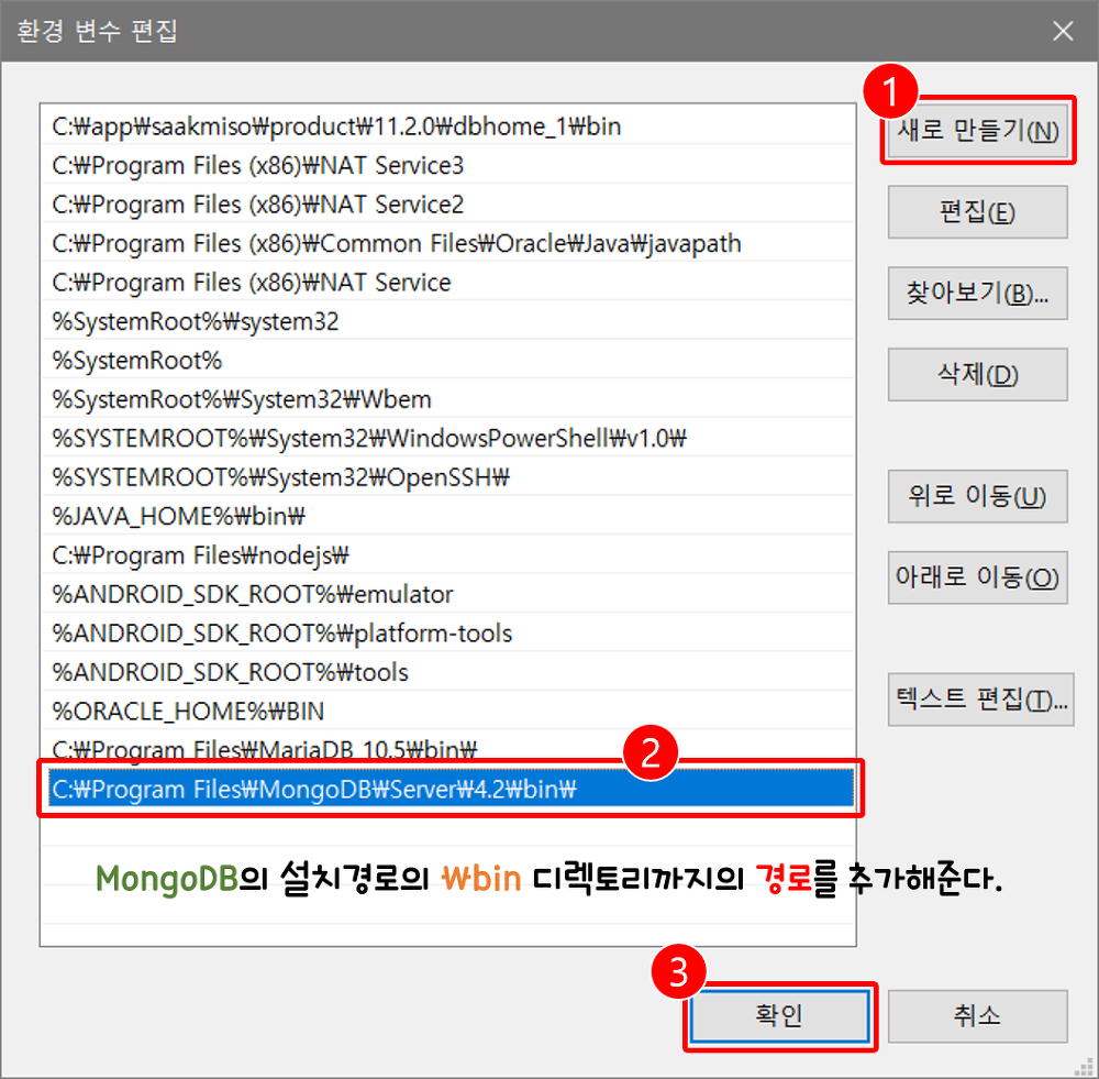 ② 설치한 몽고DB의 경로에서 (기본경로)C:\Program Files\MongoDB\Server\버전정보\bin\까지의 경로를 입력한다.