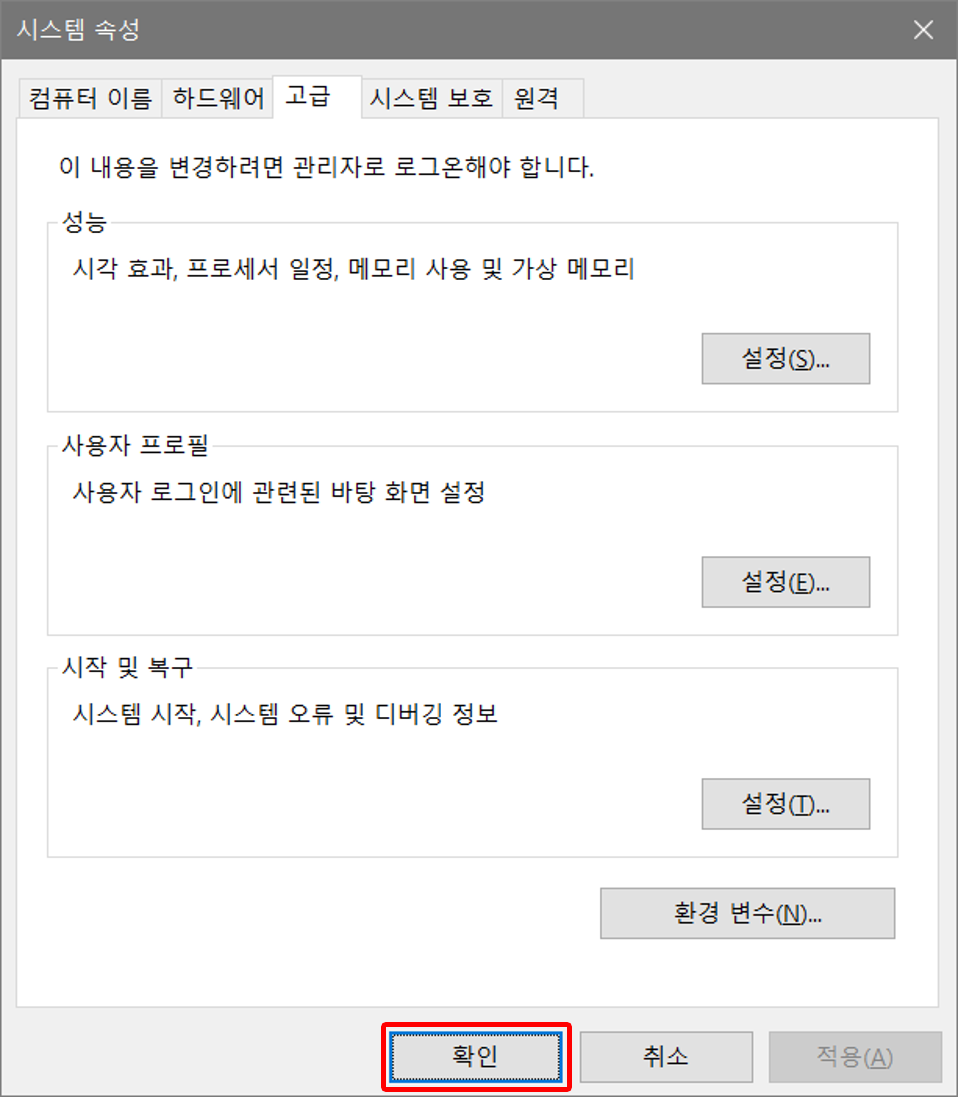 시스템 속성창도 확인 버튼을 클릭하여 닫아준다.