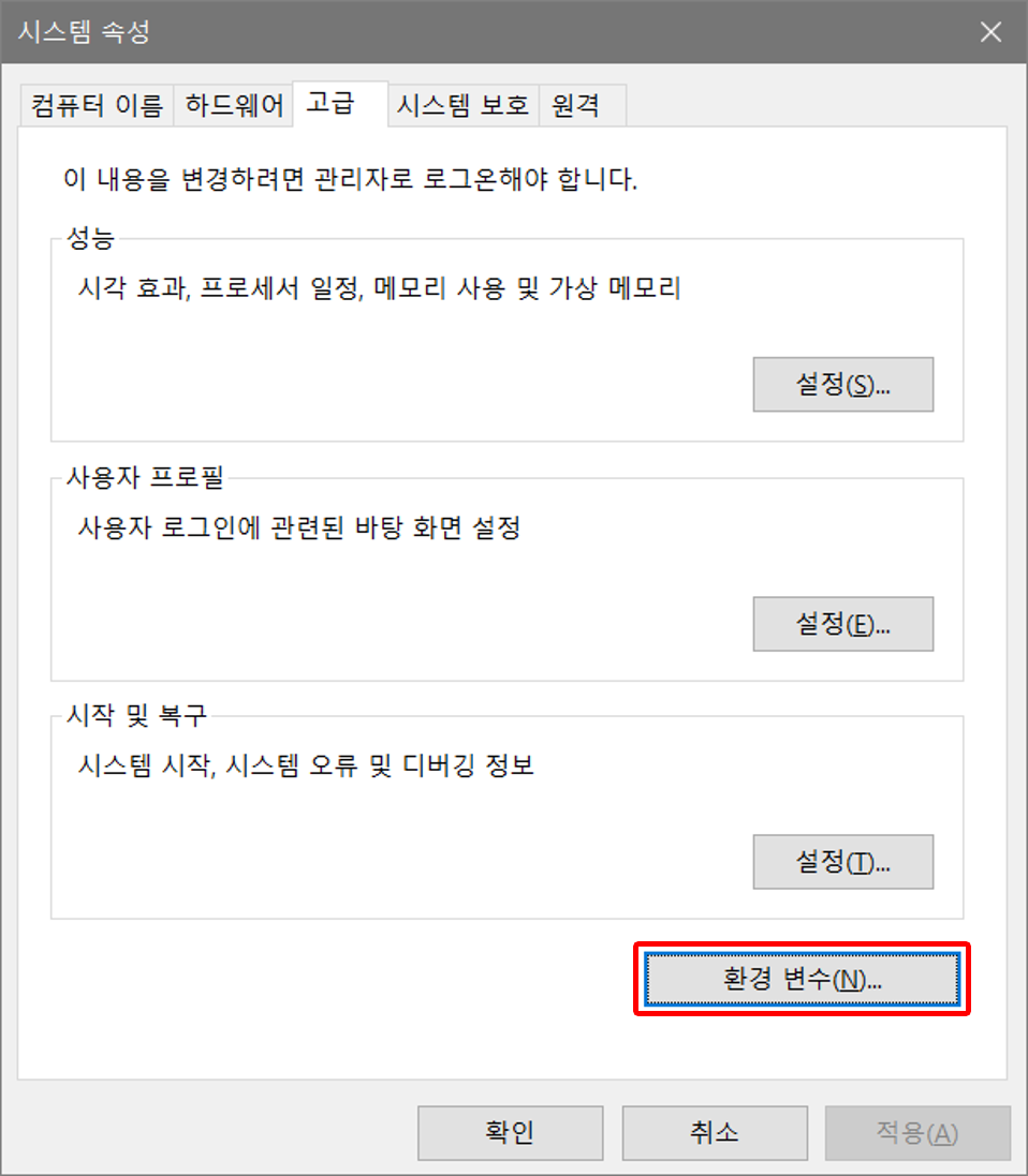시스템 속성 > 고급 > 환경 변수를 선택한다.